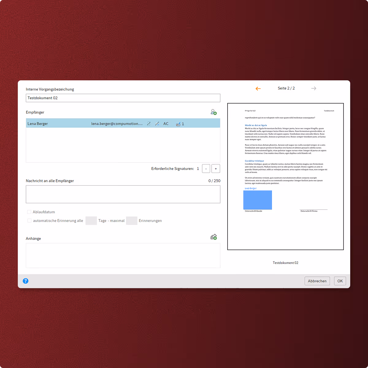 Dokumente müssen nicht mehr exportiert, manuell hochgeladen oder per E-Mail verschickt werden – die Signatur erfolgt direkt in ELO.